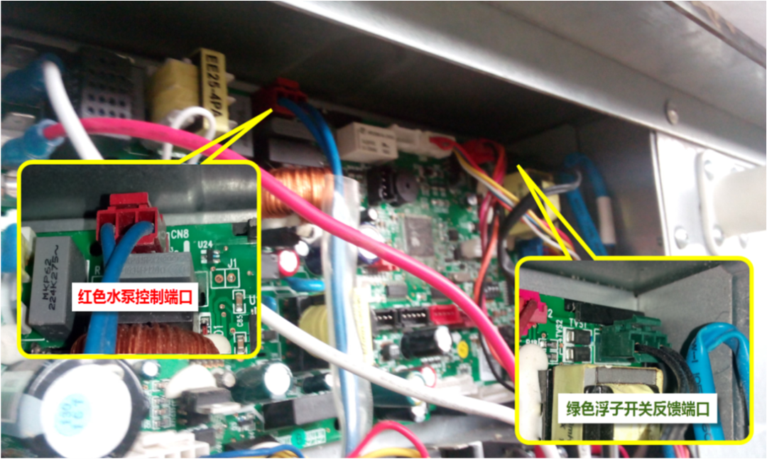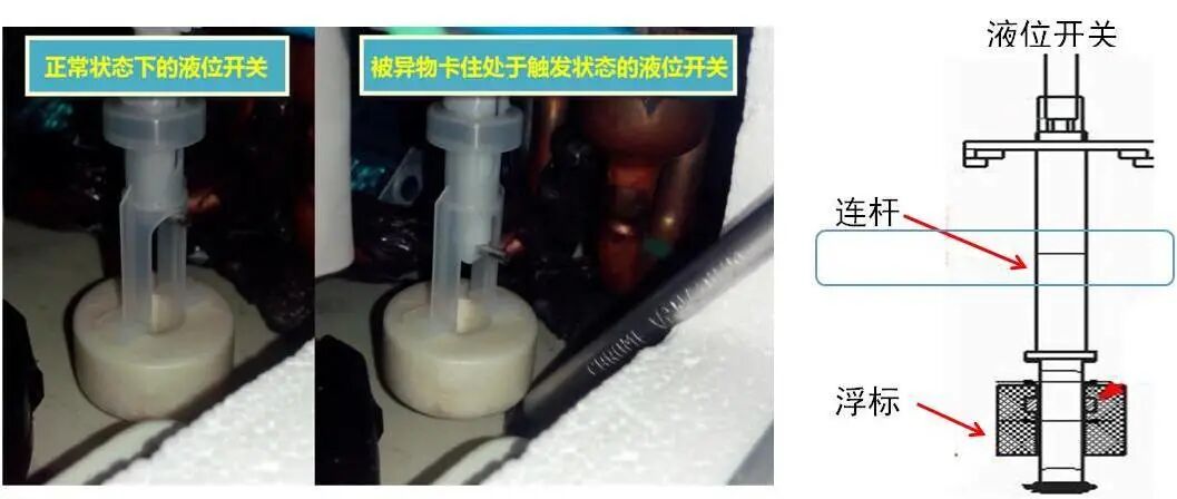 若接水盘水位很低或基本没水,或内机开机后报水满保护,可能由于浮子开关动作不良导致,检查浮子是否被异物阻塞。